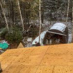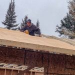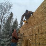 I laid out the wall plates on Friday night and made sure we were all good to go. Real early Saturday morning Terry showed up with his tools and we went over my plans. The rest of the guys were soon there and we got to it. By Saturday dinner time, the walls were up and braced and sheathing started. Sunday was another early start. By late afternoon, the roof was on and sheeted, most bracing was removed, and the site was tidied up… and it was starting to snow 🙂 We had made it!